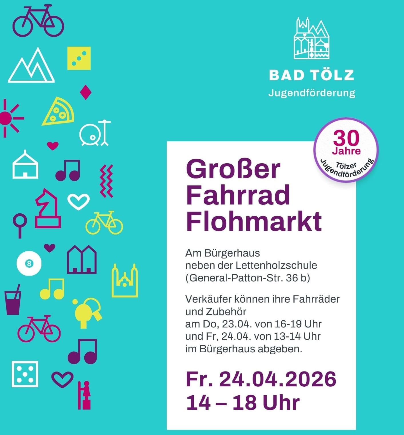 (24.4., 14 Uhr) Fahrradflohmarkt am Bürgerhaus Bad Tölz. Die Besucher sollen eine große Auswahl an gebrauchten Fahrrädern und Zubehör zu fairen Preisen erwarten. Eigene Räder können direkt vor Ort zum Verkauf abgegeben werden. Der Flohmarkt richtet sich an Fahrradliebhaber und alle, die ein passendes Rad für die neue Saison suchen. Der Eintritt ist frei, für Kaffee und Kuchen ist gesorgt.