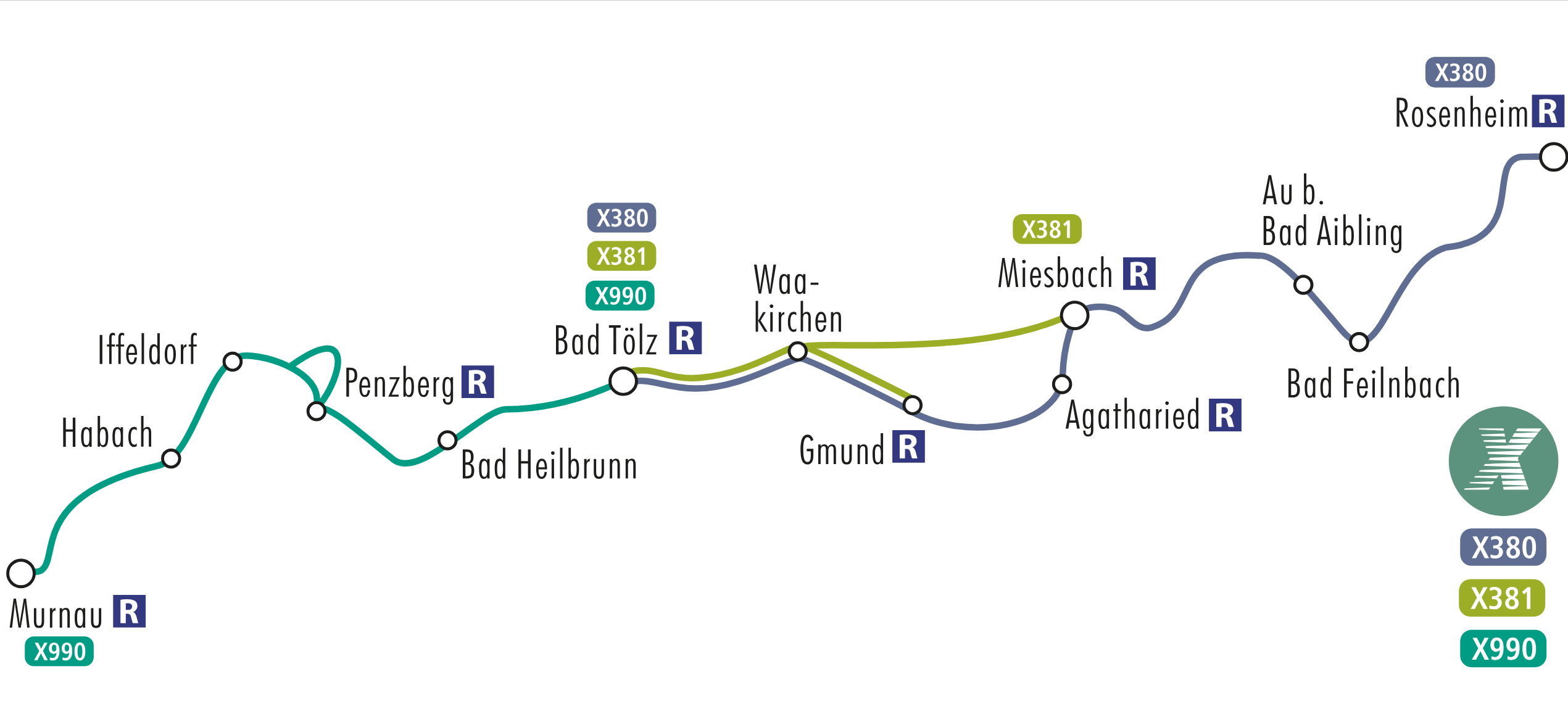 Obwohl es Expressbusse sind, sollten die Fahrzeiten nicht unterschätzt werden. So benötigt der X380, da er einen Schlenker über Gmund und Agatharied fährt, eine Stunde und 45 Minuten von Bad Tölz bis Rosenheim. Der X381 braucht von Tölz bis Miesbach dagegen nur knapp über eine halbe Stunde und der ebenfalls neue X990 benötigt für die Strecke von Bad Tölz nach Murnau 70 Minuten. Die kompletten Fahrpläne sind beim MVV zu finden.